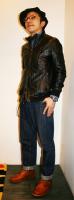 レザーブルゾンをワイルドにないすぎない加減でアウターに取り入れた